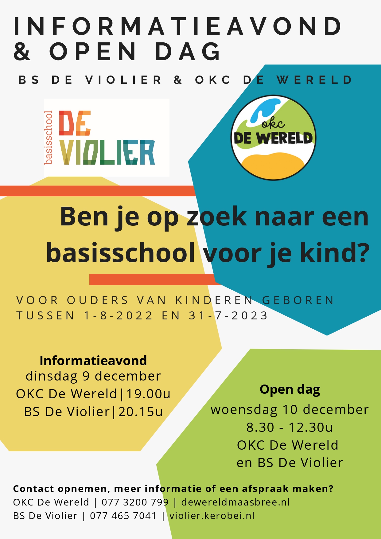 Speciaal voor ouders van kinderen die een basisschool zoeken voor hun kind dat tussen 1 augustus 2026 en 31 juli 2027 4 jaar wordt organiseren OKC de Wereld en BS de Violier samen een informatieavond en een open dag.