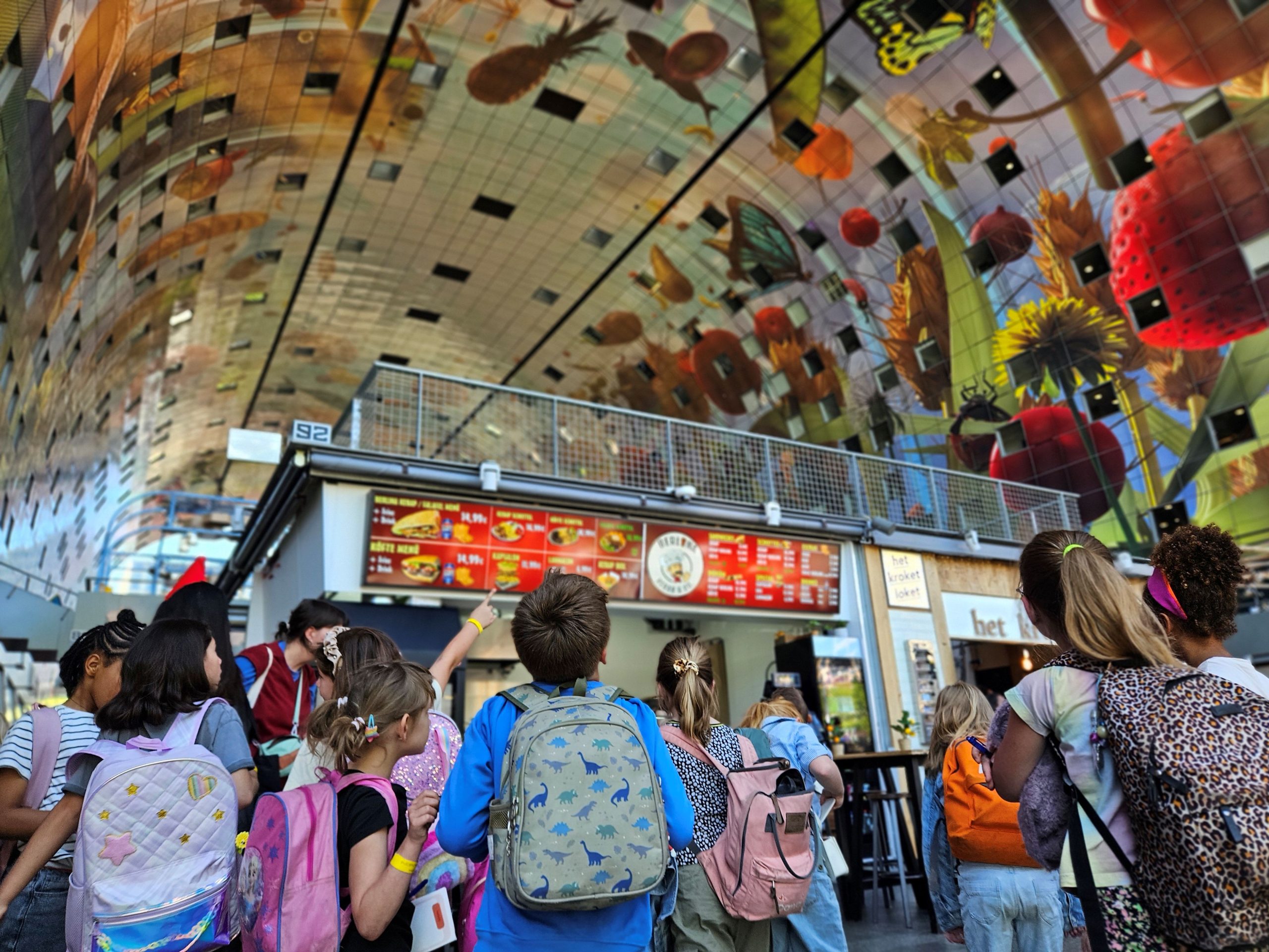 Uiteraard hadden we goed nagedacht over de veiligheid en het welbevinden van de kinderen. Immers zo’n reis is bijzonder indrukwekkend en we wilden dat elk kind een topbeleving zou hebben. Dat is gelukt doordat we onze units apart op pad hebben laten gaan. Iedere unit had een eigen, Rotterdamse, reisleider. Allemaal kunstdocenten met ervaring in het begeleiden van kinderen. De kinderen van unit 1 bleven in de buurt van de Maas en liepen naar het park richting de Euromast. Onderweg hebben wij, via een verhaal, allerlei interessante zaken over kleine dieren in Rotterdam ontdekt. Uiteindelijk hebben ze samen als afloop een feestje gevierd en heerlijk gepicknickt in het park. Unit 2 is met de metro naar het Centraal Station gereisd, daar werd de tram gepakt naar de Coolsingel en van daaruit gewandeld langs de Binnenrotte (dat is een riviertje) naar Blaak. Als echte toeristen ontdekten ze typische Rotterdamse zaken en er werd geluncht op de trappen voor de kubuswoningen met uitzicht op de Markthal. Daarna mochten ze in de kelder van de kunstacademie een eigen souvenir knutselen. Unit 3 mocht direct de Erasmusbrug over lopen en ging op bezoek bij een kunstenares op een heel bijzondere woonboot. Er werden pamfletten gemaakt en die werden onderweg naar Blaak op diverse plekken geplakt; vrije ‘plakplekken’ waar iedereen die dat wil zijn of haar posters op mag hangen. Uiteindelijk kwamen zij ook op Blaak terecht en lunchten op de trappen bij de kunstacademie.